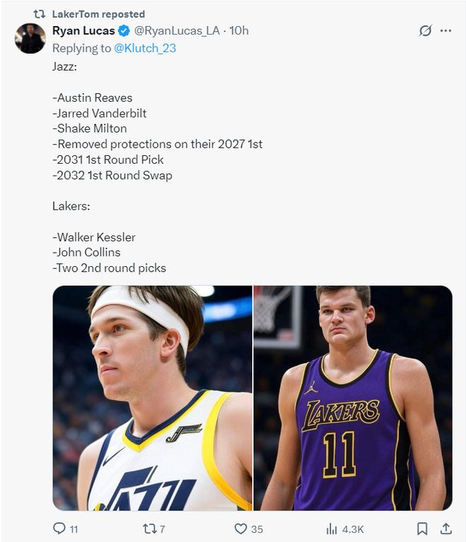 爵士得到:里夫斯、范德比尔特、米尔顿、湖人2031年首轮、湖人2031年首轮互换权。